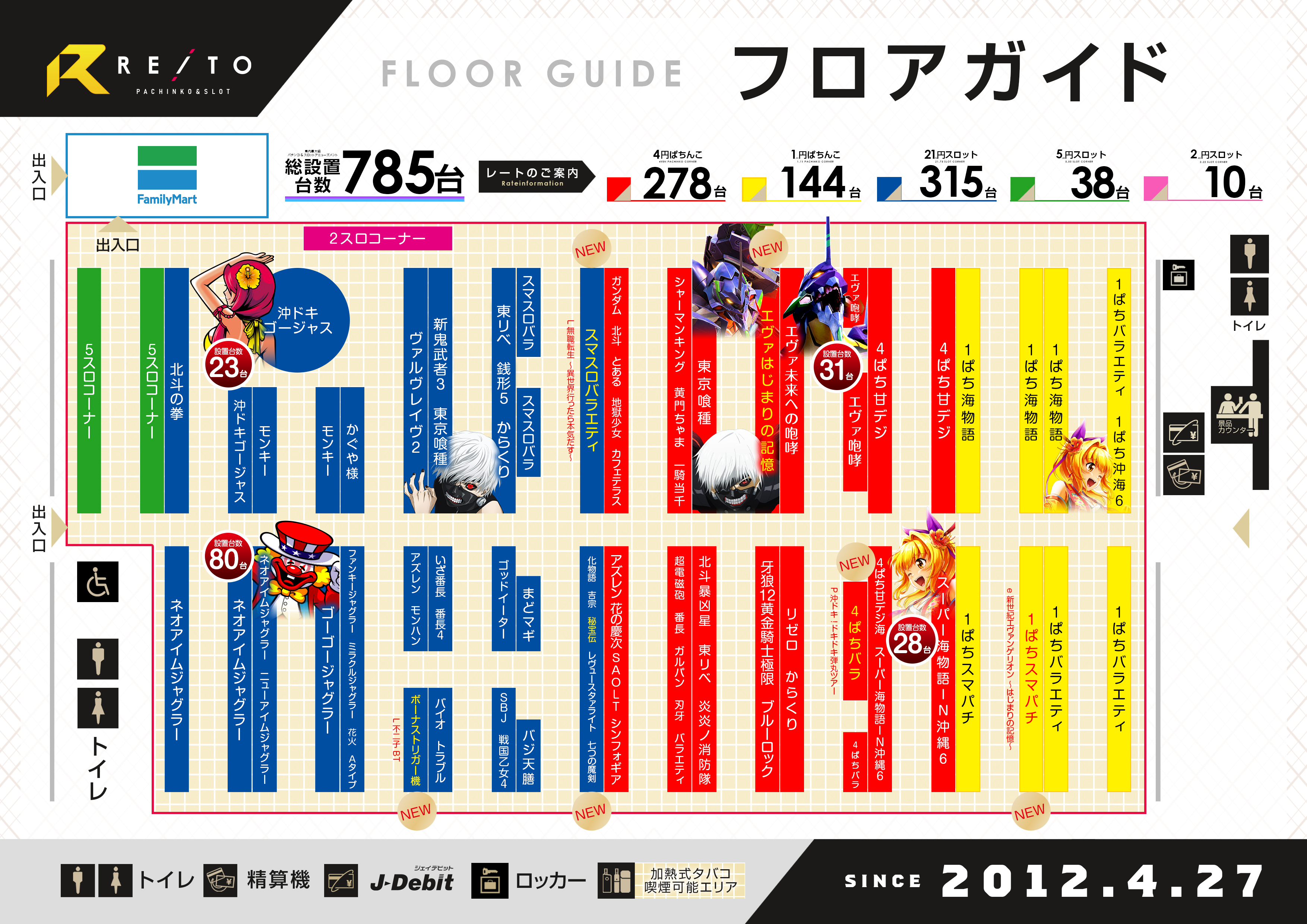 | 台数 | 台数 : パチンコ 422 台 / スロット 363 台 |