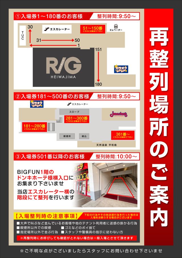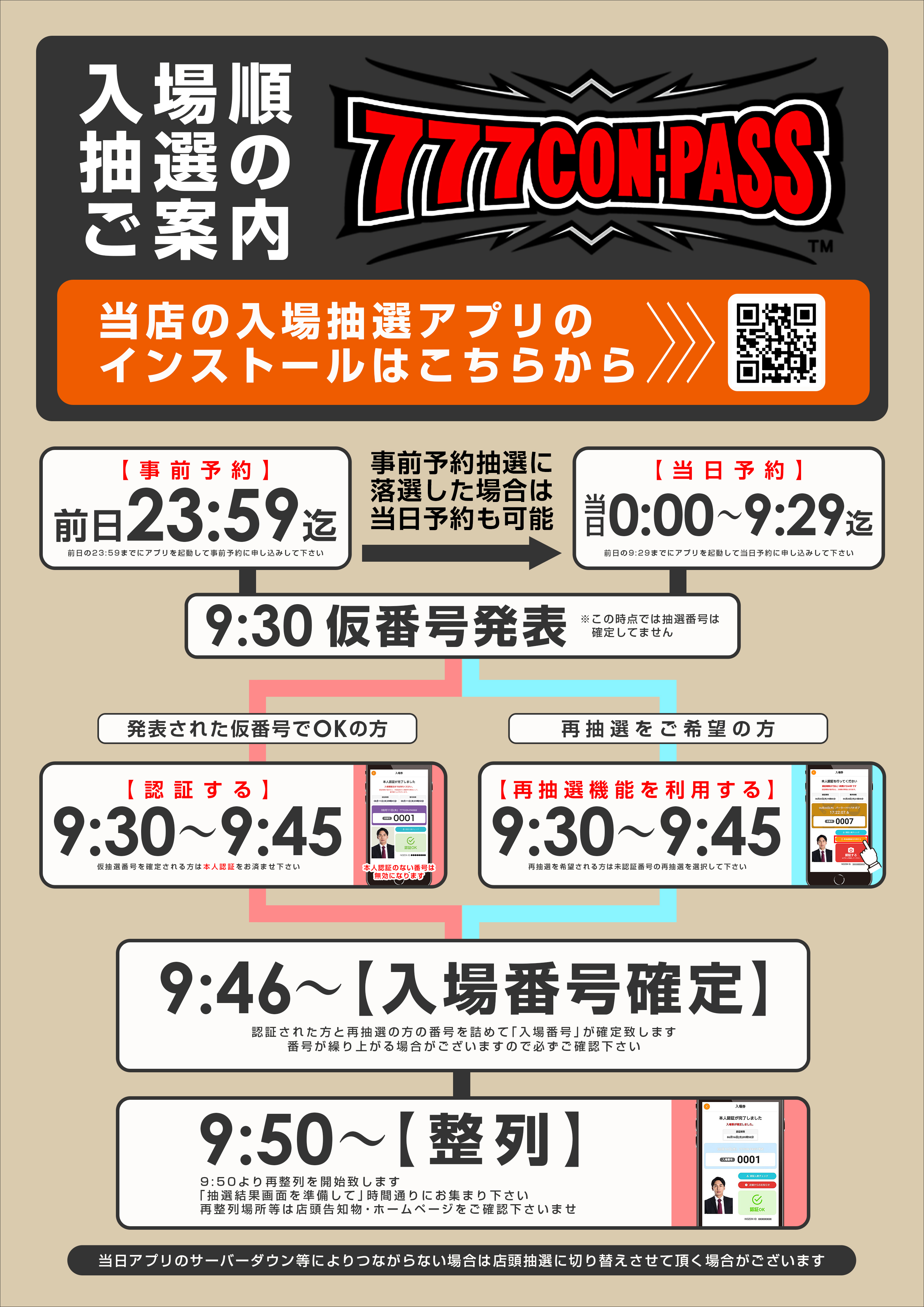 ルール詳細 | WEB抽選(777CON-PASS)にて抽選を行います。事前予約は前日の23:59迄、当日予約は9:29迄になります。9:45までに再抽選・本人認証を済ませて下さいませ。整列は9:50から行います。 |