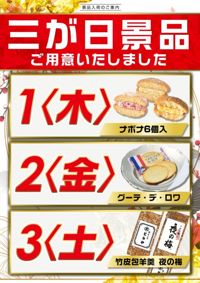| ルール詳細 | ■8:30までにお並び頂いたお客様を対象に店頭抽選にて【入場券】を配布致します。 ■8:55にて【入場券】の番号順で再整列させて頂きますのでお集まりください。 ※再整列時にご不在の場合は【抽選最後尾】からの入場になりますのでご了承ください。 |