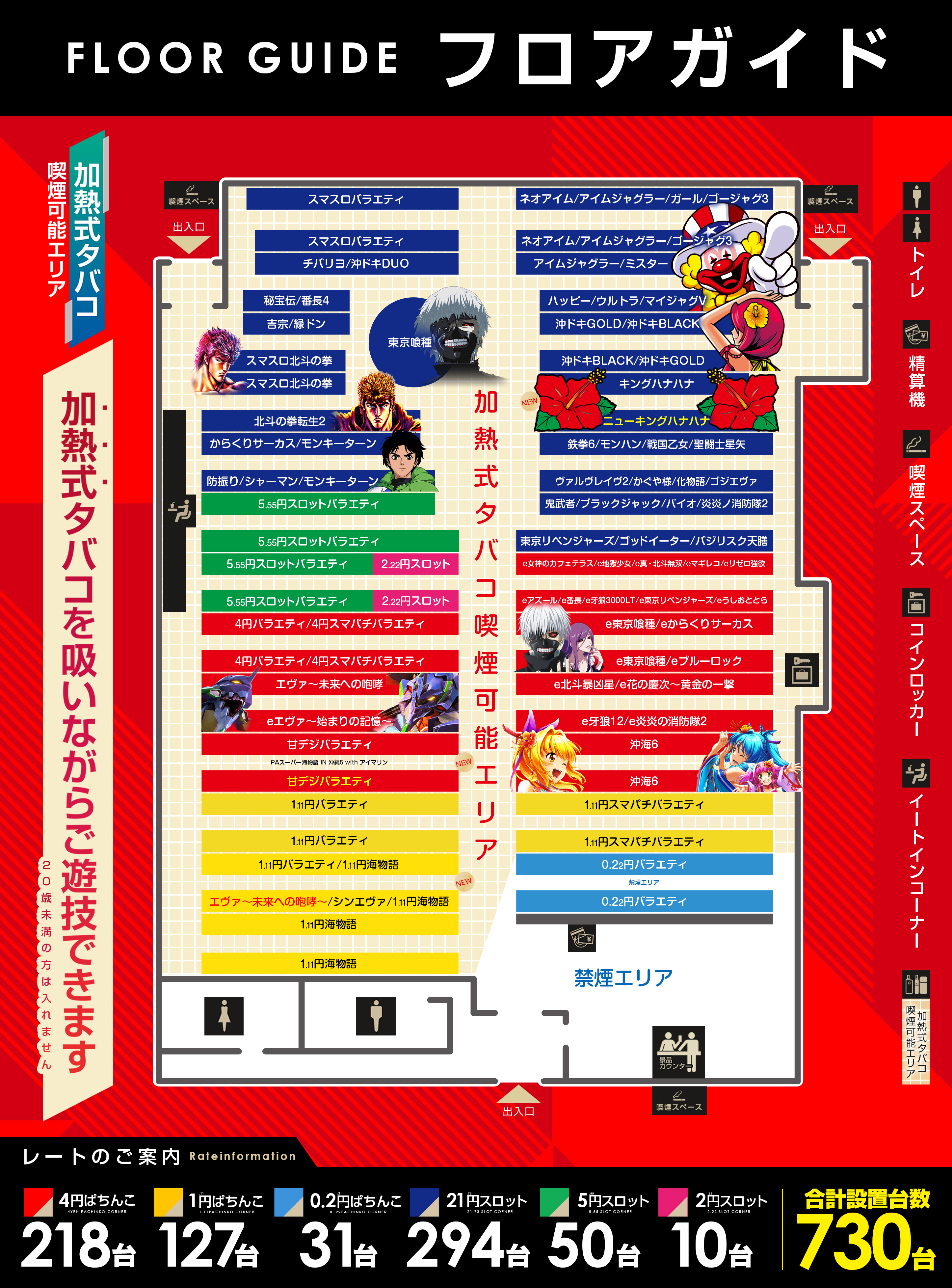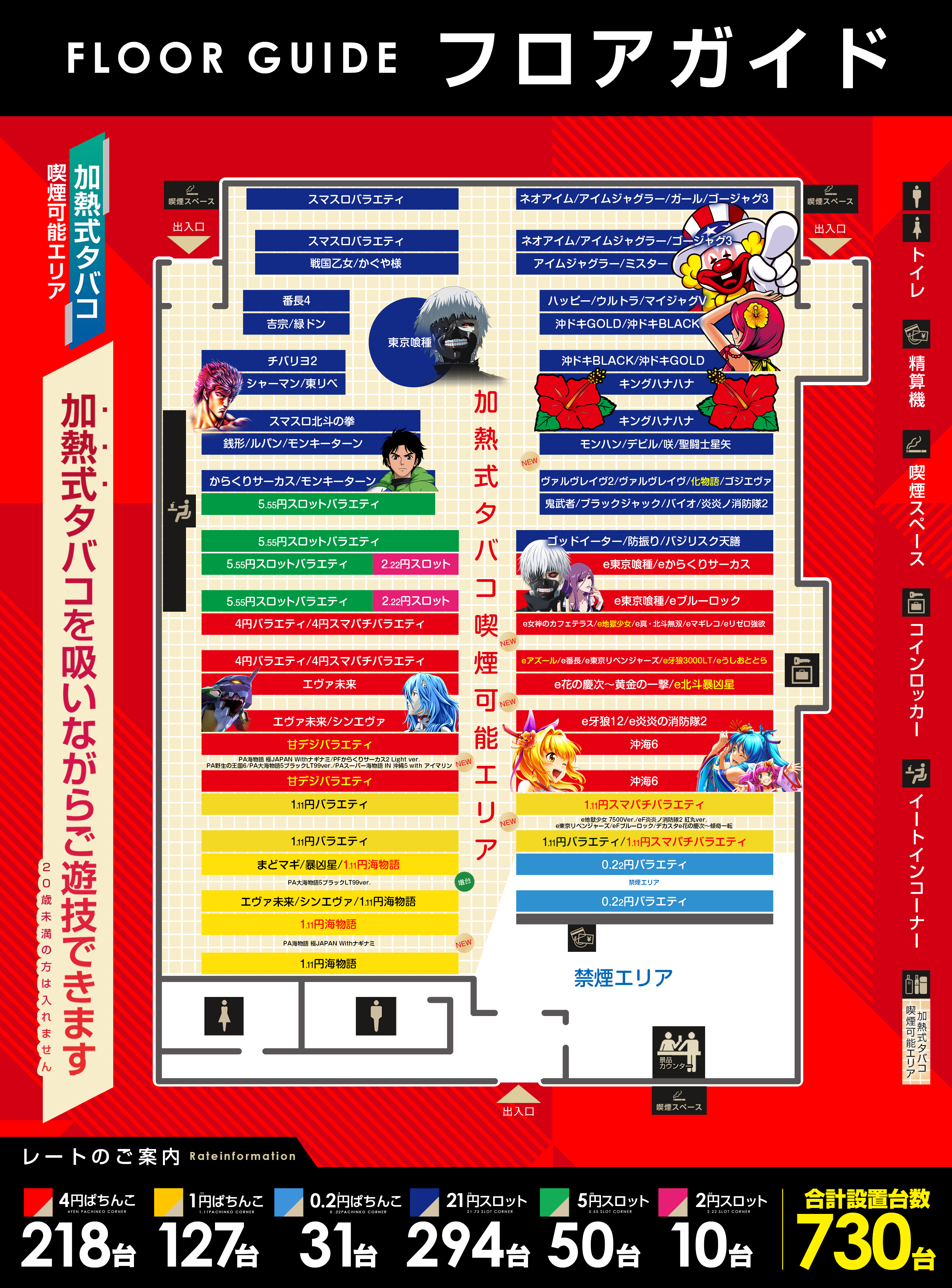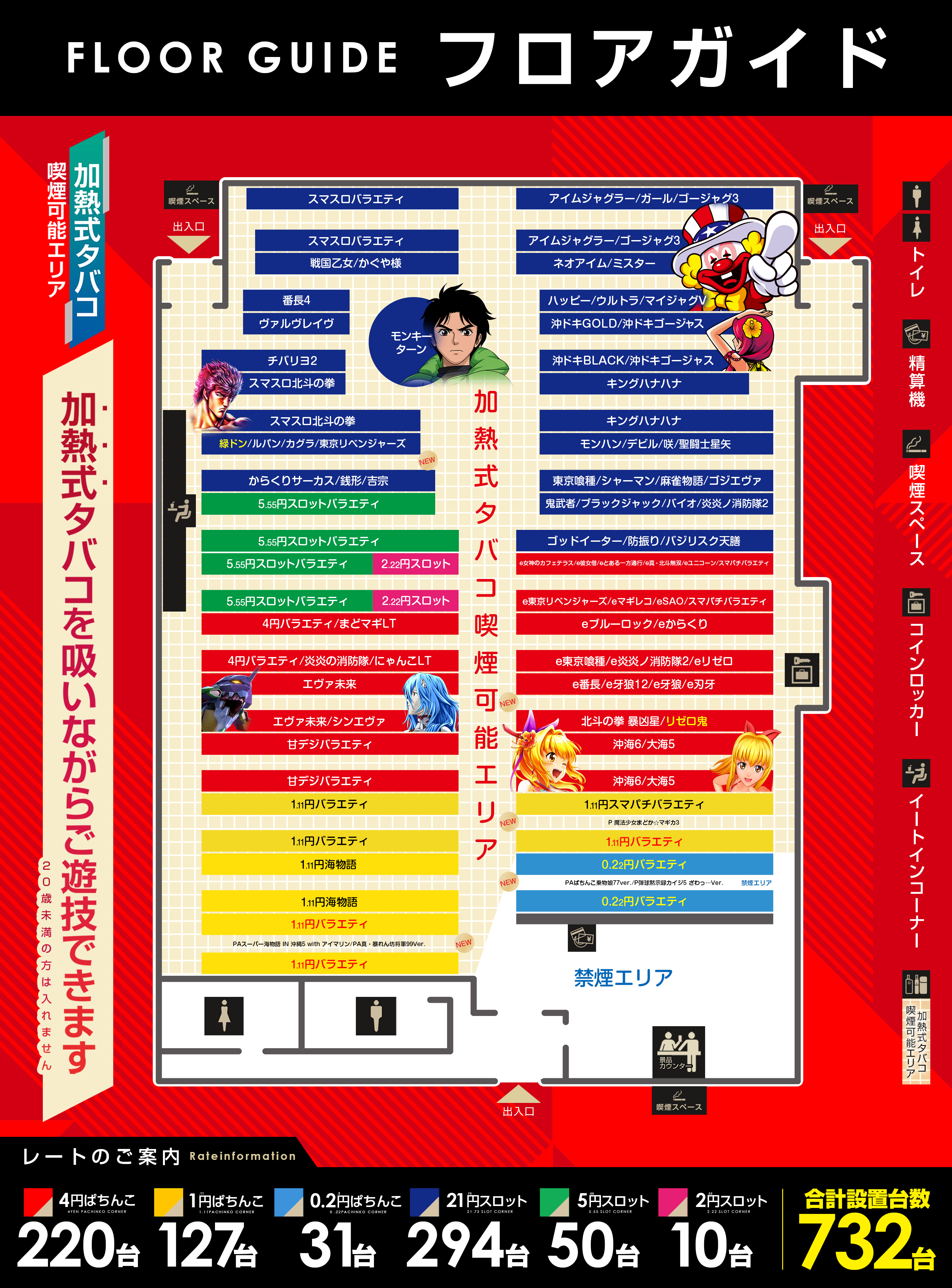 | 台数 | 台数 : パチンコ 378 台 / スロット 354 台 |