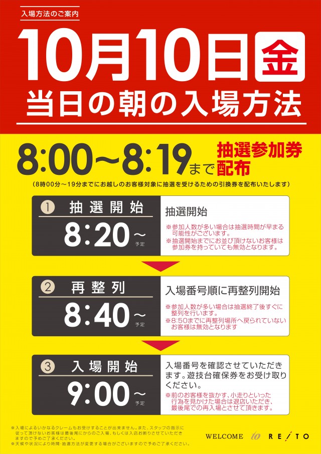 ルール詳細 | AM9:00より抽選番号順にご入場となります。 ※入り口前8:45より抽選番号順にお並びください。 |