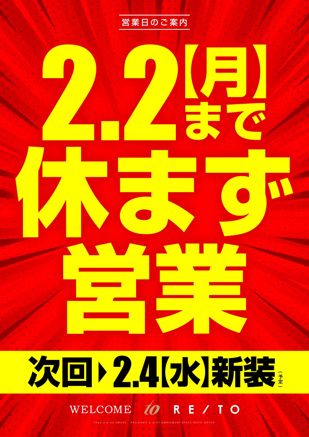 | ルール詳細 | ①入場券配布:8:30までに店頭までお越しください。 抽選にて「入場券」を配布致します。 ②再整列:8:45までにお集まりください。 整列時ご不在の場合や、抽選番号の確認が取れない時は、最後尾からご入場いただくことがあります。 ご理解とご協力をお願い致します。 ③入場開始:9:00より。 スタッフにより順次入場のご案内をいたします。 【運営会社】株式会社ラチオ【設立】昭和62年6月3日 【代表者】平文暉朗【事業内容】遊技場経営 【住所】茨城県つくば市天久保2-8-18 |